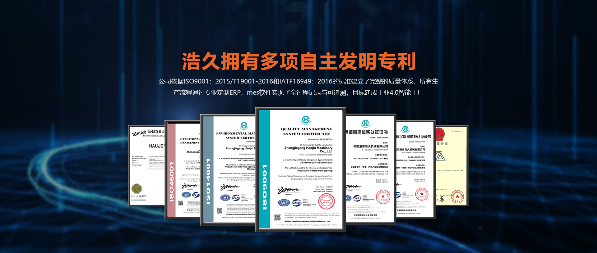 浩久擁有多項自主發(fā)明專利。公司依據ISO9001GB/T19001-2016和IATF:2016的標準建立了完整的質量體系,所有生產流程通過專業定制ERP,mes軟件實現了全過程記錄與可追溯,目標建成工業4.0智能工廠。